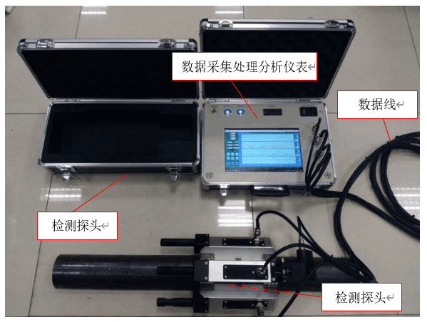 有线:整机系统由检测探头、数据采集处理分析仪表和数据线构成。探头为多同模块化3瓣式,可适应不同直径管圆周面的检测;数据采集处理分析仪表有10-16通道数据通讯及显示、信号软硬件滤波/放大处理、检测结果报表生成和声音报警功能;数据线共4根,其中3根为3瓣式探头的信号连接线、1根为编码测距的信号连接线。