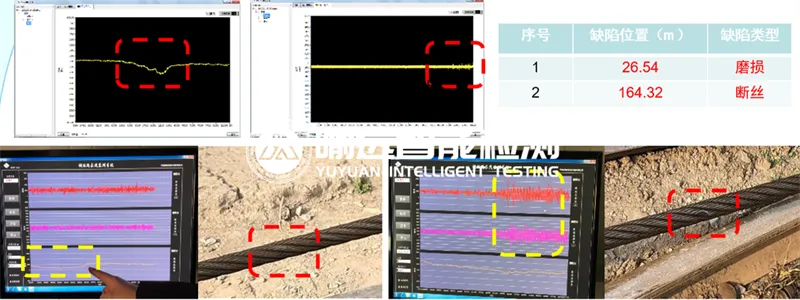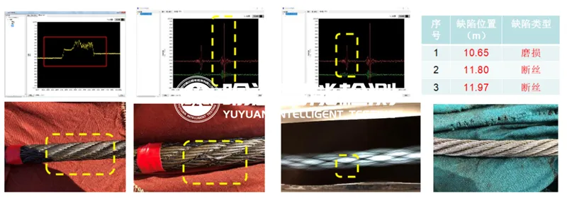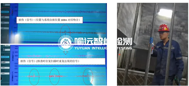 (在荆门某矿上,钢丝绳检测系统发现2处严重异常信号,经现场核查,缺陷与监测数据一致)