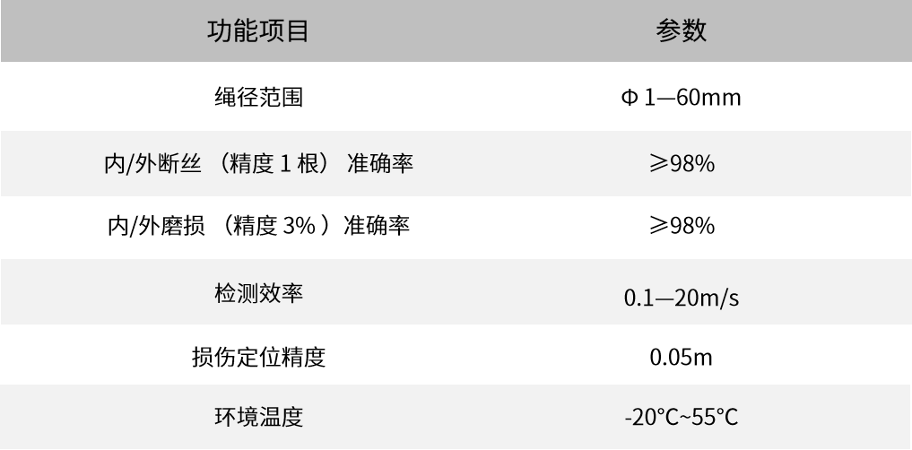产品特点:检测探头优于常规C型开口检测装置,实现全绳段360度全包围检测,检测范围及面积最大最全。